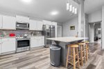 The interior of the house features three well-appointed bedrooms, providing ample sleeping arrangements for all guests. The two bathrooms are equipped with modern amenities, ensuring convenience and comfort during your stay. The open floor plan of the living area creates a welcoming atmosphere, with a fully-equipped kitchen, dining space, and a cozy living room. There is covered parking for two cars and room for 2 more cars in the driveway